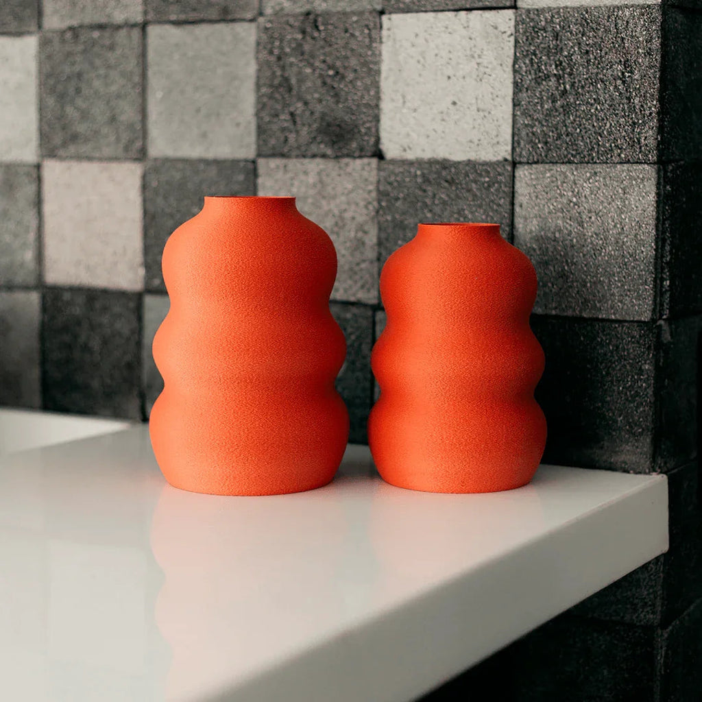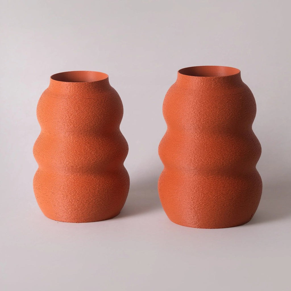 Este conjunto de vasos apresenta um design ondulado e textura de barro, ideal para arranjos de plantas ou flores em ambientes internos e externos. Fabricado em bioplástico via impressão 3D, oferece durabilidade e um acabamento artesanal.