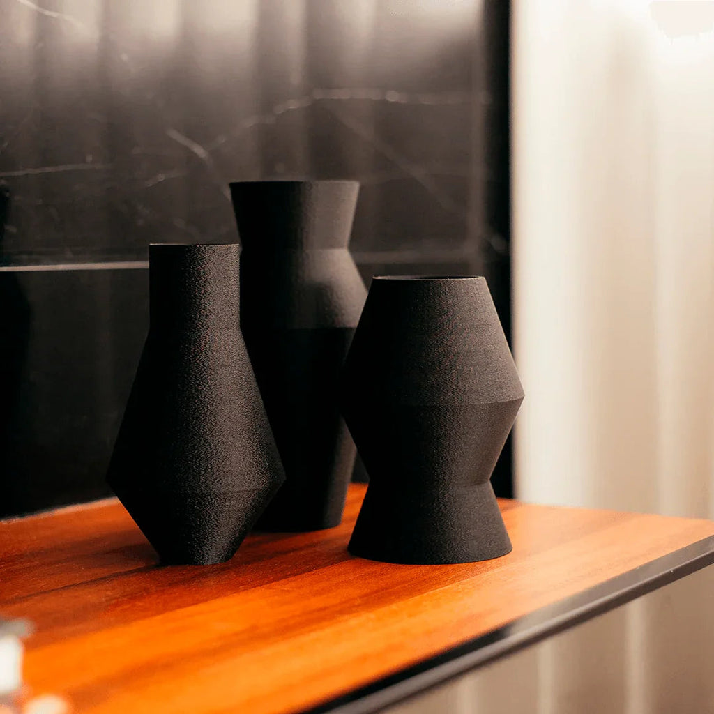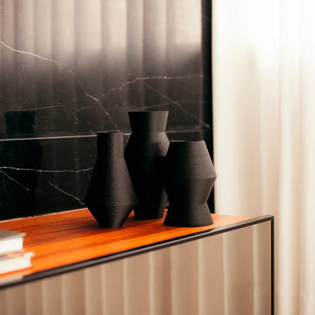 Este conjunto de vasos geométricos minimalistas é impresso em 3D, oferecendo um design contemporâneo. Cada peça possui dimensões e pesos distintos, proporcionando versatilidade na decoração.
