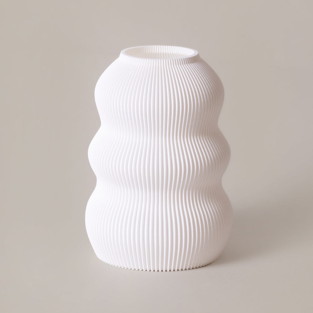 O Vaso Ondas Filetado é uma peça de 18 cm com design rústico e orgânico, ideal para ambientes internos e externos. Fabricado em bioplástico via impressão 3D, seu acabamento branco terracota confere durabilidade e um toque natural sofisticado.