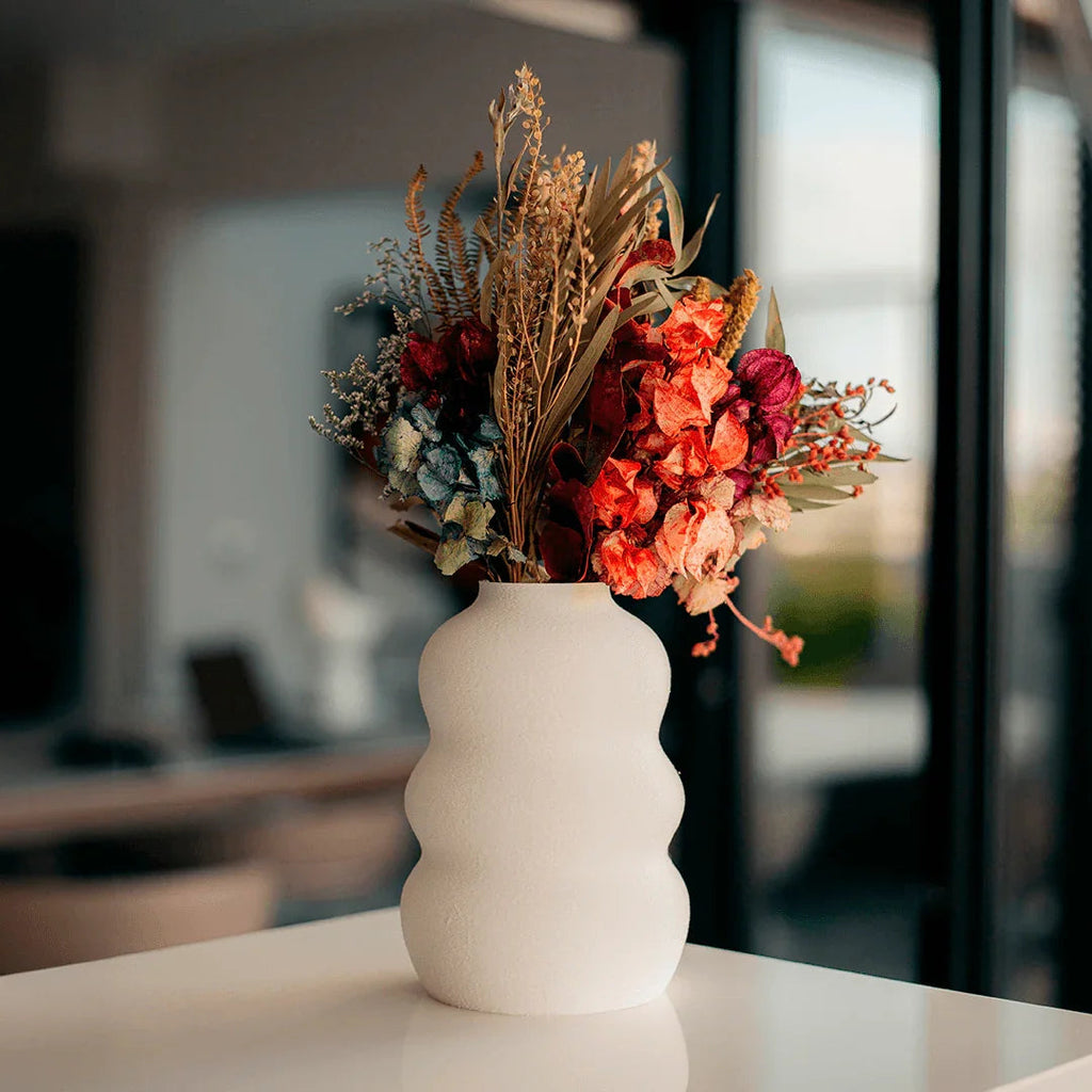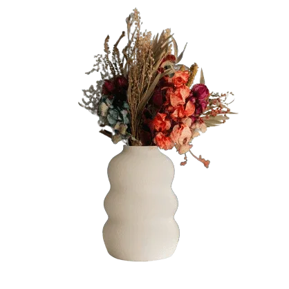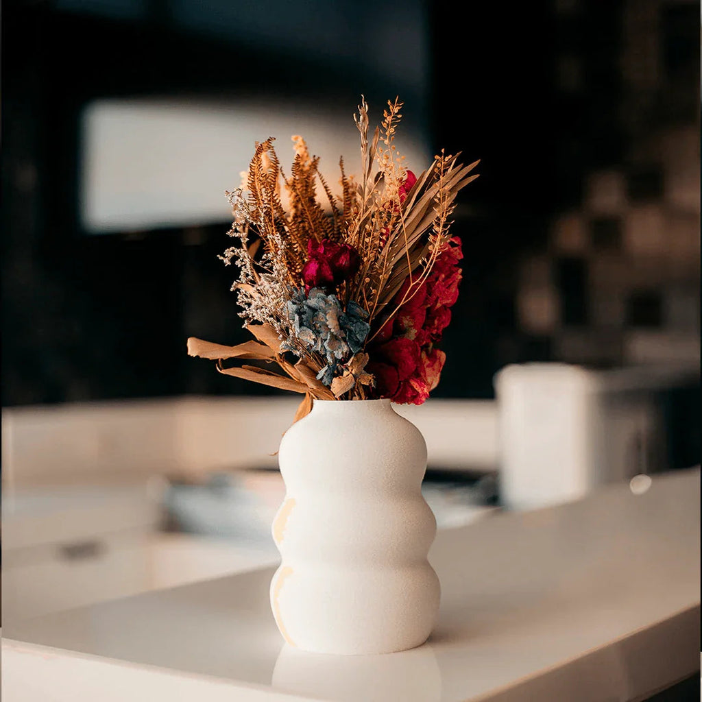 O Vaso Ondas Texturizado apresenta um design rústico e orgânico, ideal para arranjos de flores ou plantas secas e artificiais em ambientes internos e externos. Fabricado em bioplástico via impressão 3D, sua textura simula barro com acabamento branco terracota, conferindo durabilidade e um toque natural e sofisticado.